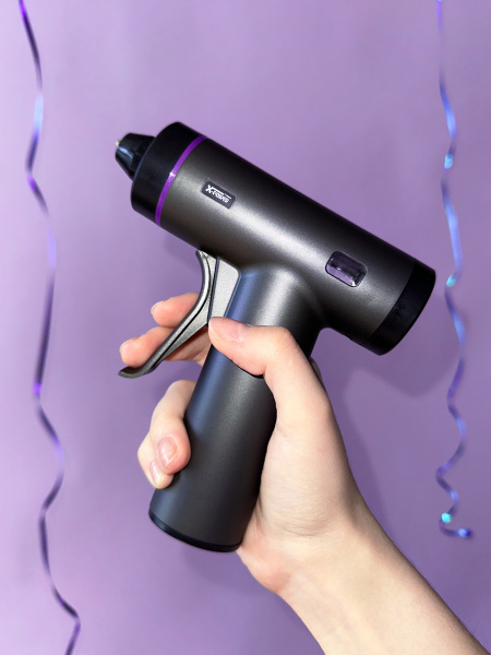 Аккумуляторный клеевой пистолет с ручной подачей клея. Нагревается до 100°C за 30 секунд, оснащён батареей 2000 мАч с быстрой зарядкой через Type-C за 3 часа. Клей дозируется курком, как в обычном пистолете. Размер 141×155 мм, вес 440 г. В комплекте 12 клеевых стержней