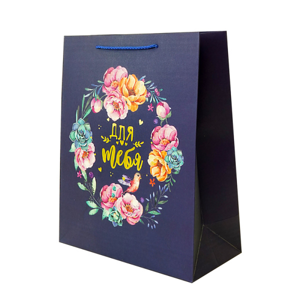 Снаружи пакет покрыт глянцевой ламинацией, что придает ему прочность, а изображению - яркость и насыщенность. Для придания дополнительного блеска на пакете есть элементы с тиснением фольгой.