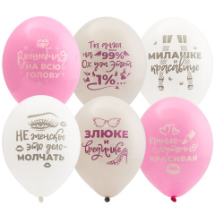 Высококачественный шар из натурального латекса. Ассорти из трех цветов, одного типа - пастель - матовый оттенок цвета. Шары с двусторонним шелкографическими рисунком - надписями: Круглосуточно красивая. Волшебная на всю голову. Злючке и врединке. Ты Ангел на 99%. Ох уж этот 1%... Не женское это дело - молчать. Милашке и красавице. Идеальный ассортимент для розничной продажи воздушных шариков и украшения праздника. Воздушные шары изготавливаются из экологически безопасного 100%-ного натурального латекса. В окружающей среде разлагаются на безопасные компоненты примерно с той-же скоростью, как обычные листья деревьев. После использования лопнуть и утилизировать как бытовой отход.
